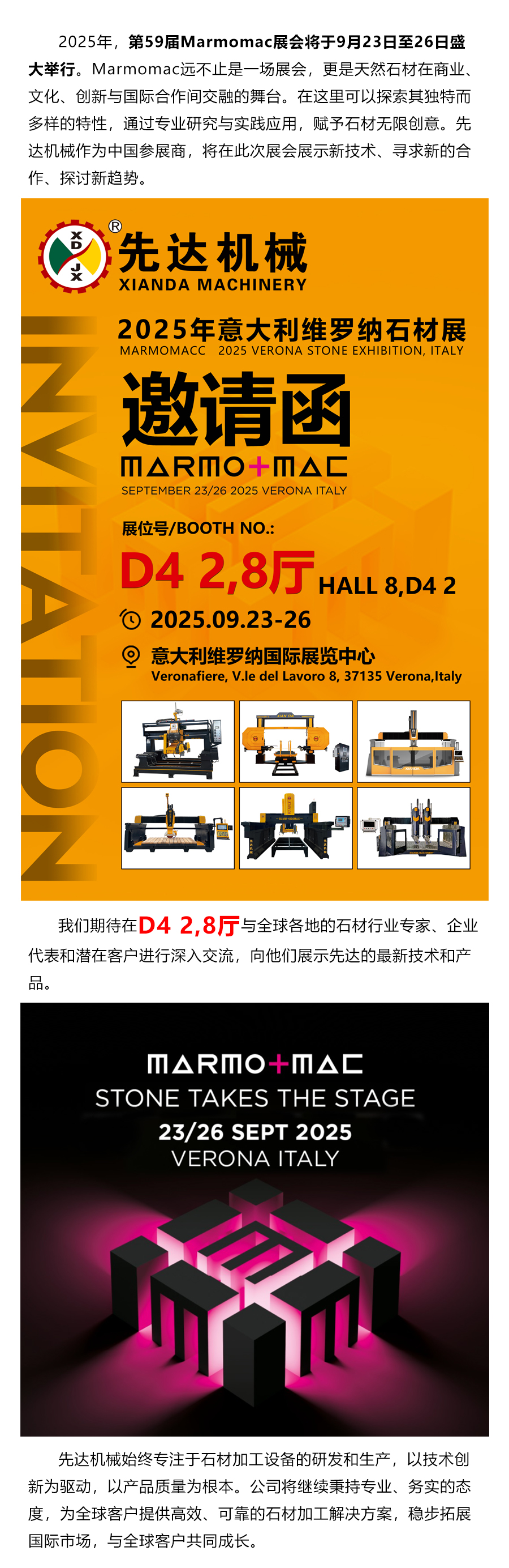 先達(dá)機(jī)械誠邀石材界精英共赴2025年意大利維羅納石材展!